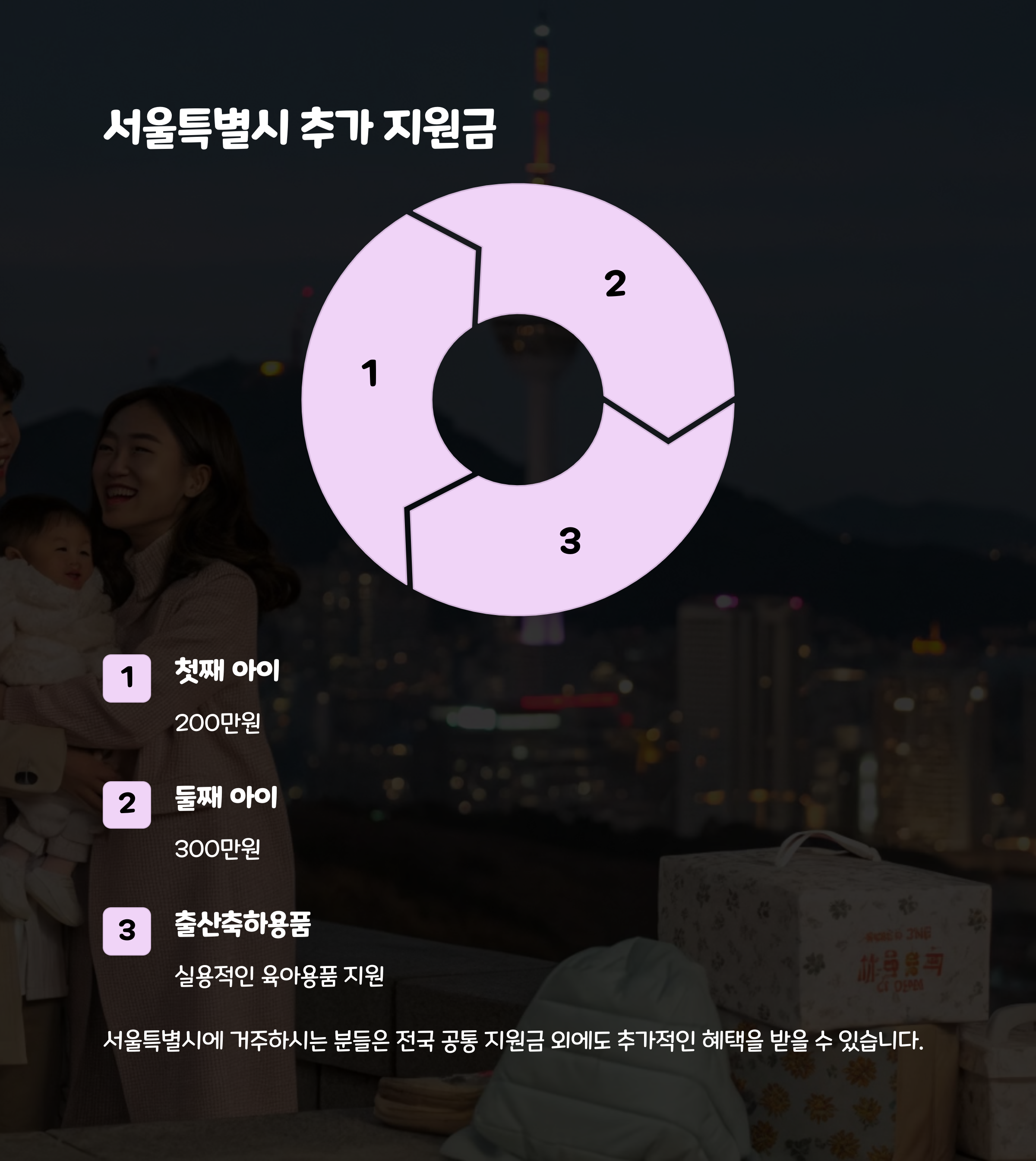 예를 들어, 서울특별시에서는 첫째 아이에게 200만 원, 둘째 아이에게는 300만원을 추가로 지원해준답니다! 대박!