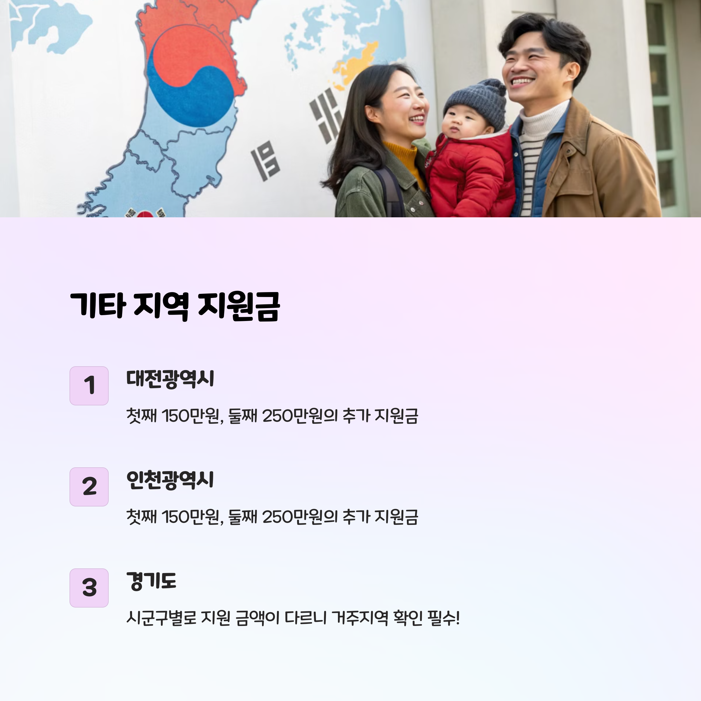 또한, 대전광역시와 인천광역시에서는 첫째 아이에게 150만 원, 둘째 아이에게 250만 원을 지원하고 있어요.