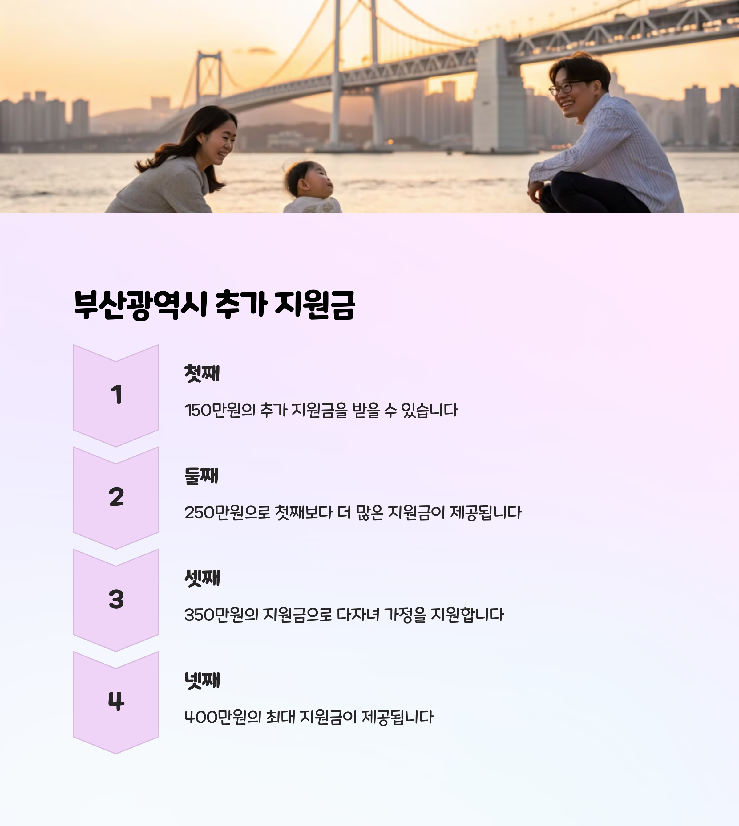 부산은 셋째 이상 아이에게도 추가 지원금이 제공되며, 셋째는 350만 원, 넷째는 400만 원을 지원해준답니다.