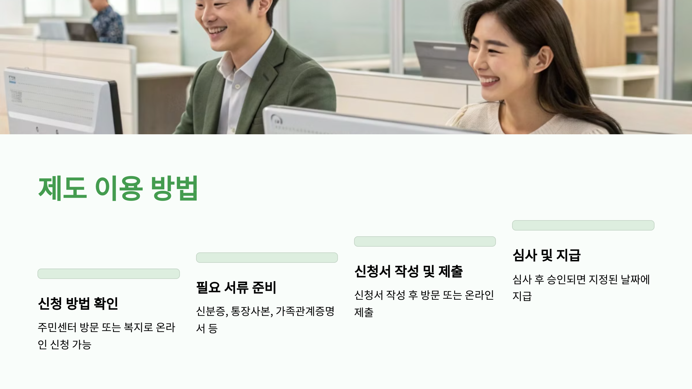 제도의 혜택을 누리기 위해서는 정해진 절차에 따라 신청하고, 관련 지원금을 받으세요.