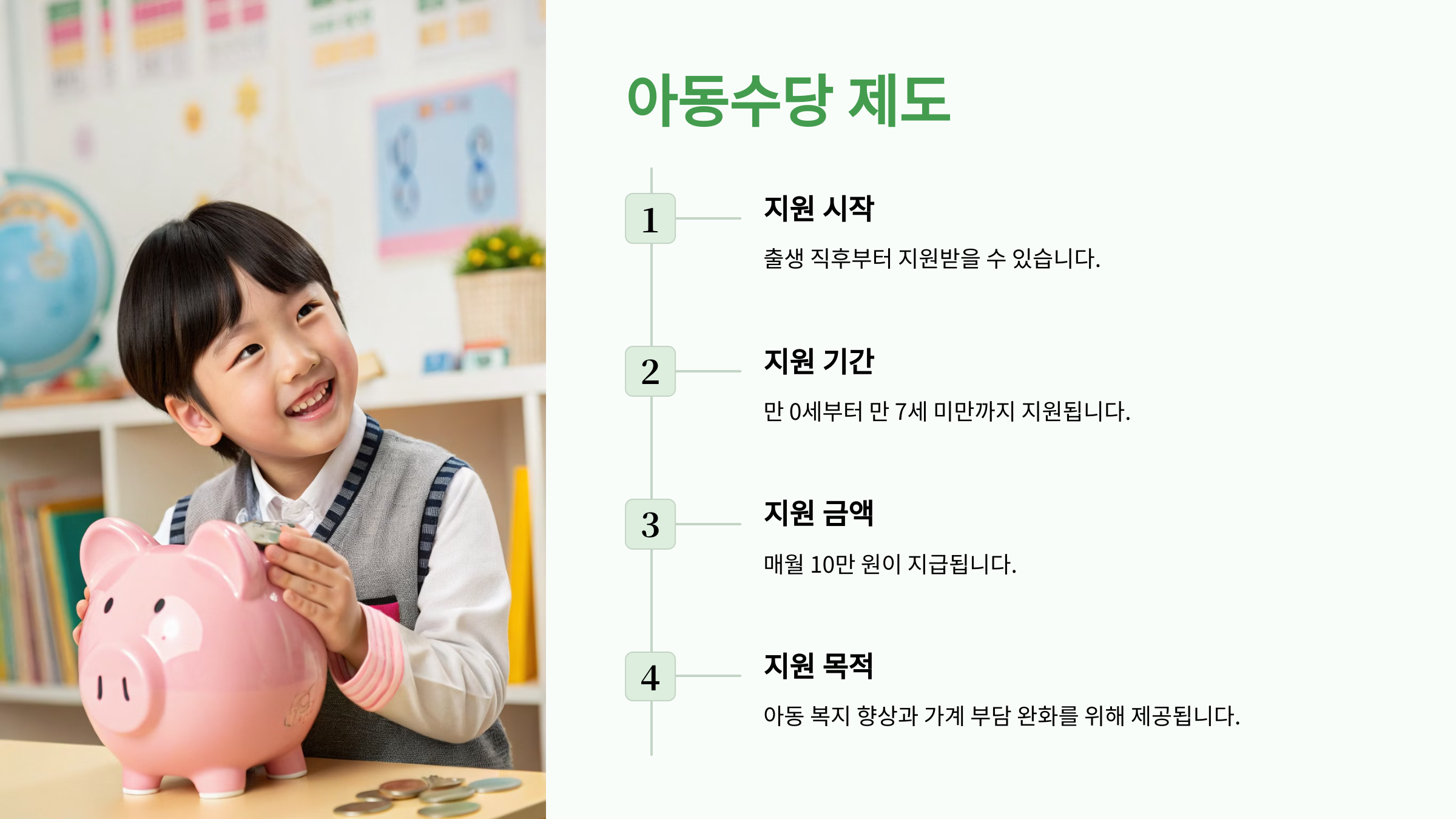 부모에게 금전적 지원을 제공해 부모의 경제적 부담을 덜어주고, 아동의 건강한 발달을 돕습니다.