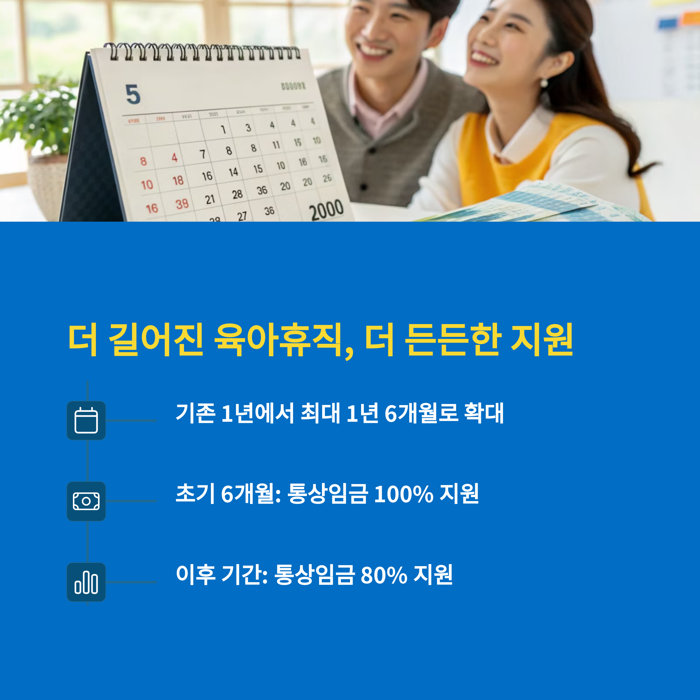 기존 1년이었던 육아휴직 기간이 1년 6개월까지 확대되고, 급여 지급 방식