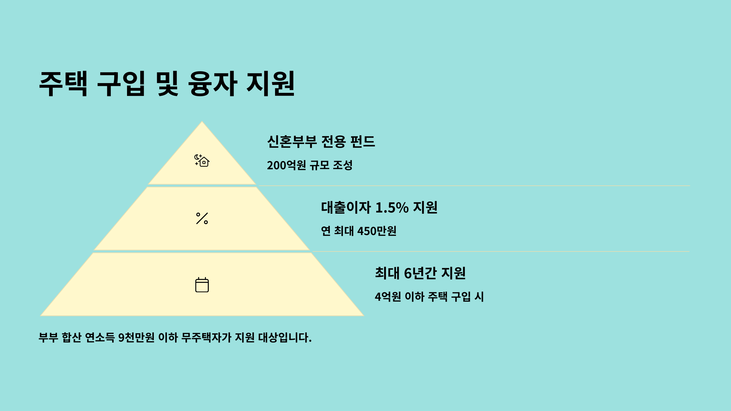 | 신혼부부 주거지원 | 전세자금 대출이자 연 2.25% 지원 (최대 10년) | 무주택 신혼부부 | 2025년까지 공공임대주택 공급 예정 |