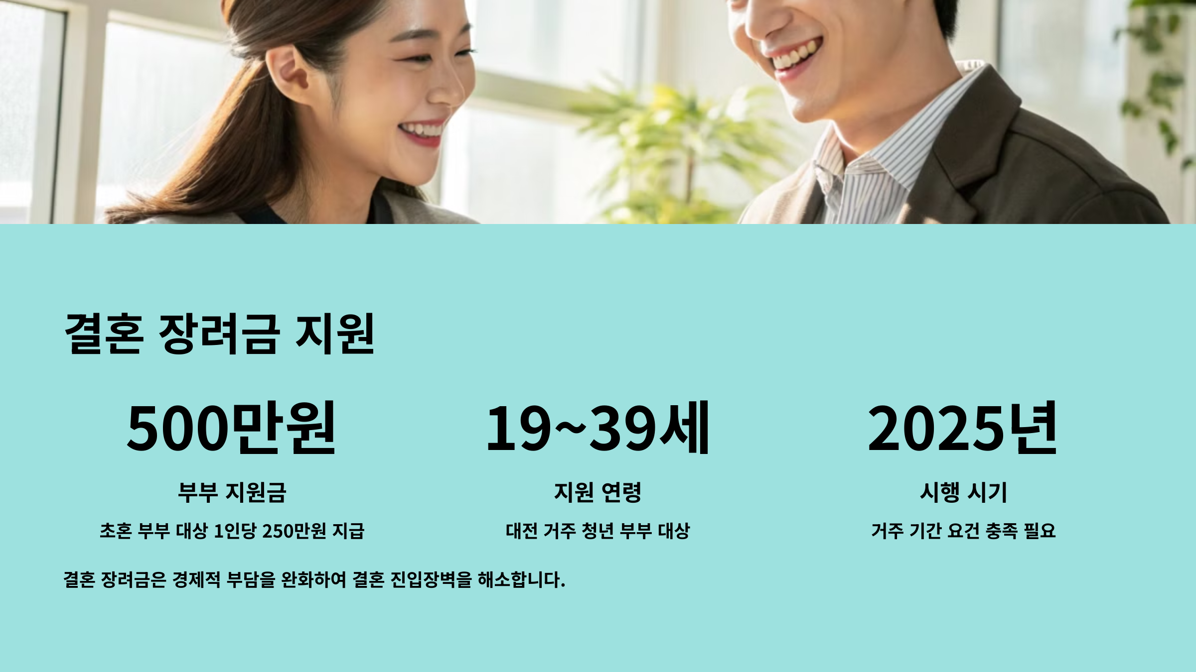 결혼장려금 지원 | 최대 500만 원 (부부 기준) | 만 19~39세, 대전 거주 6개월 이상 신혼부부 | 2024년 이후 혼인신고 부부 대상 |