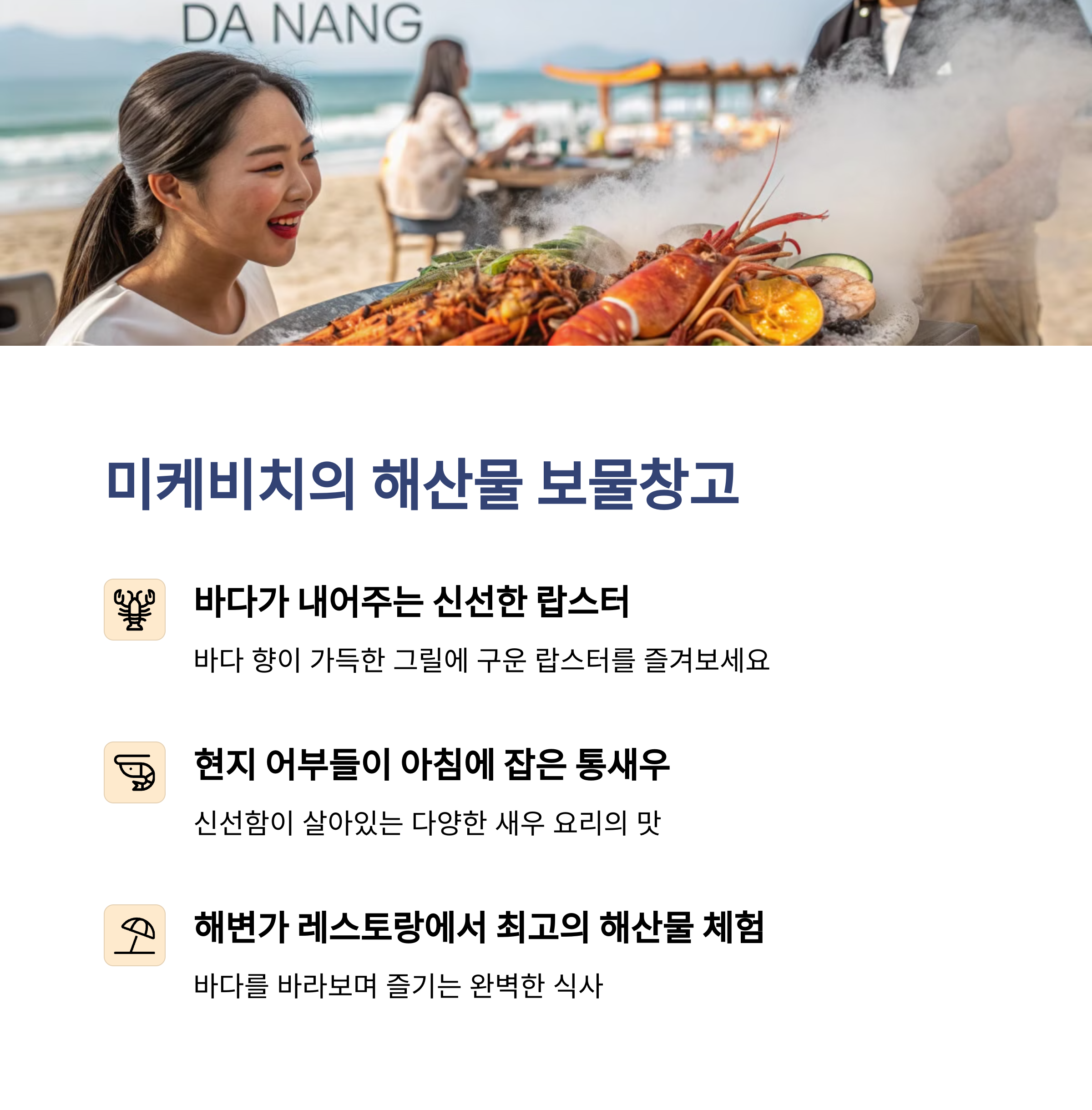 | 미케비치 인근 신선한 해산물 | 새콤달콤 소스와 고기 조합 | 진한 국물 맛 쌀국수 |