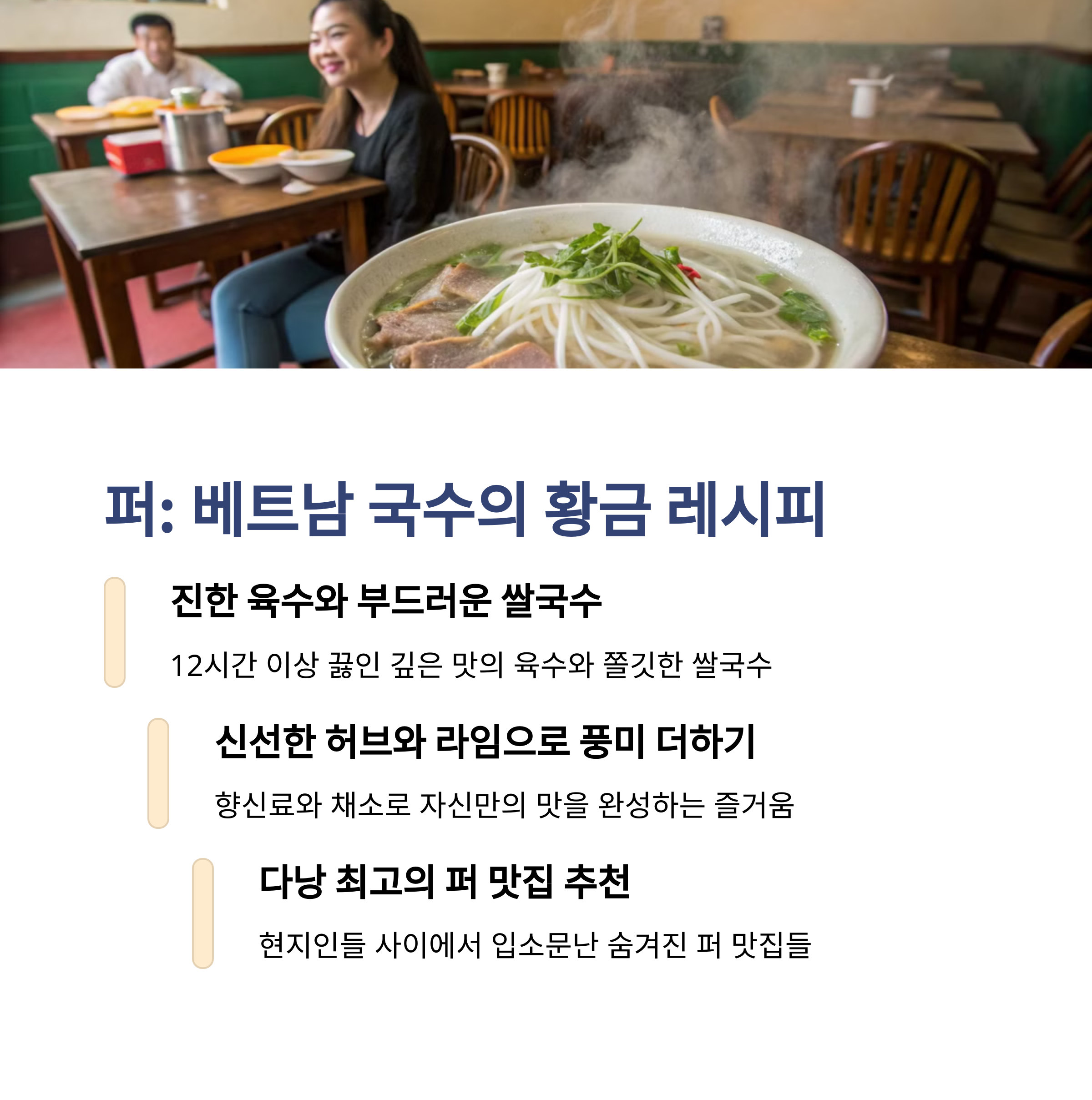 퍼(쌀국수) 맛집도 추천합니다. 깊고 진한 국물 맛이 일품인 다낭의 퍼는 우리나라 쌀국수와는 또 다른 매력을 지니고 있습니다. 깔끔한 국물에 다양한 고명을 추가해 먹을 수 있으며, 현지인들이 아침식사로 즐기는 경우가 많아 오전에 방문하면 신선한 쌀국수를 맛볼 수 있습니다. 다낭 여행의 하루를 든든하게 시작하고 싶다면 퍼 맛집 방문은 필수입니다.