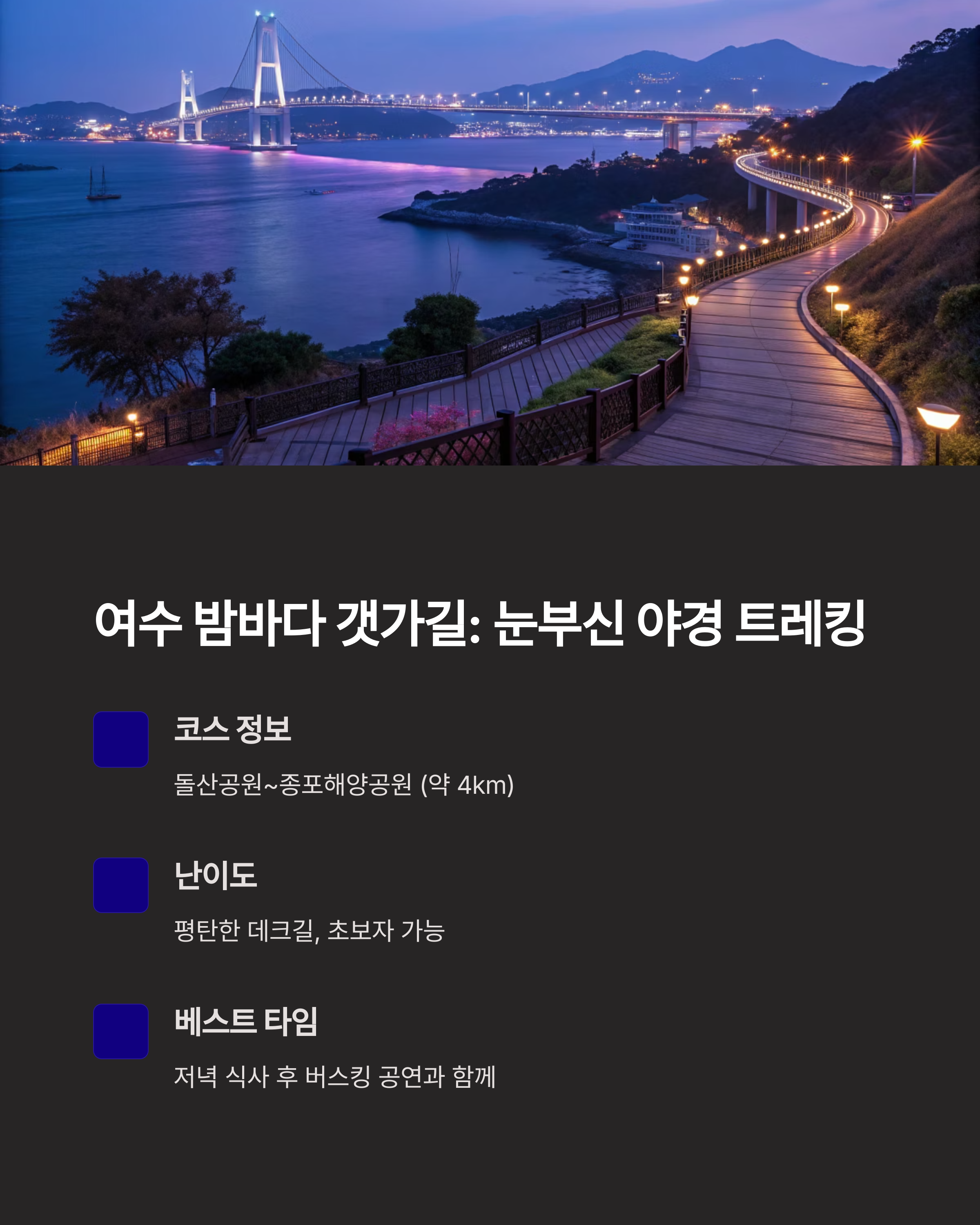 특히 바다를 따라 걷는 트레킹 코스는 여수 지역 여행의 백미로 꼽히며, 맛집 추천과 건강한 식습관까지 모두 만족시킬 수 있는