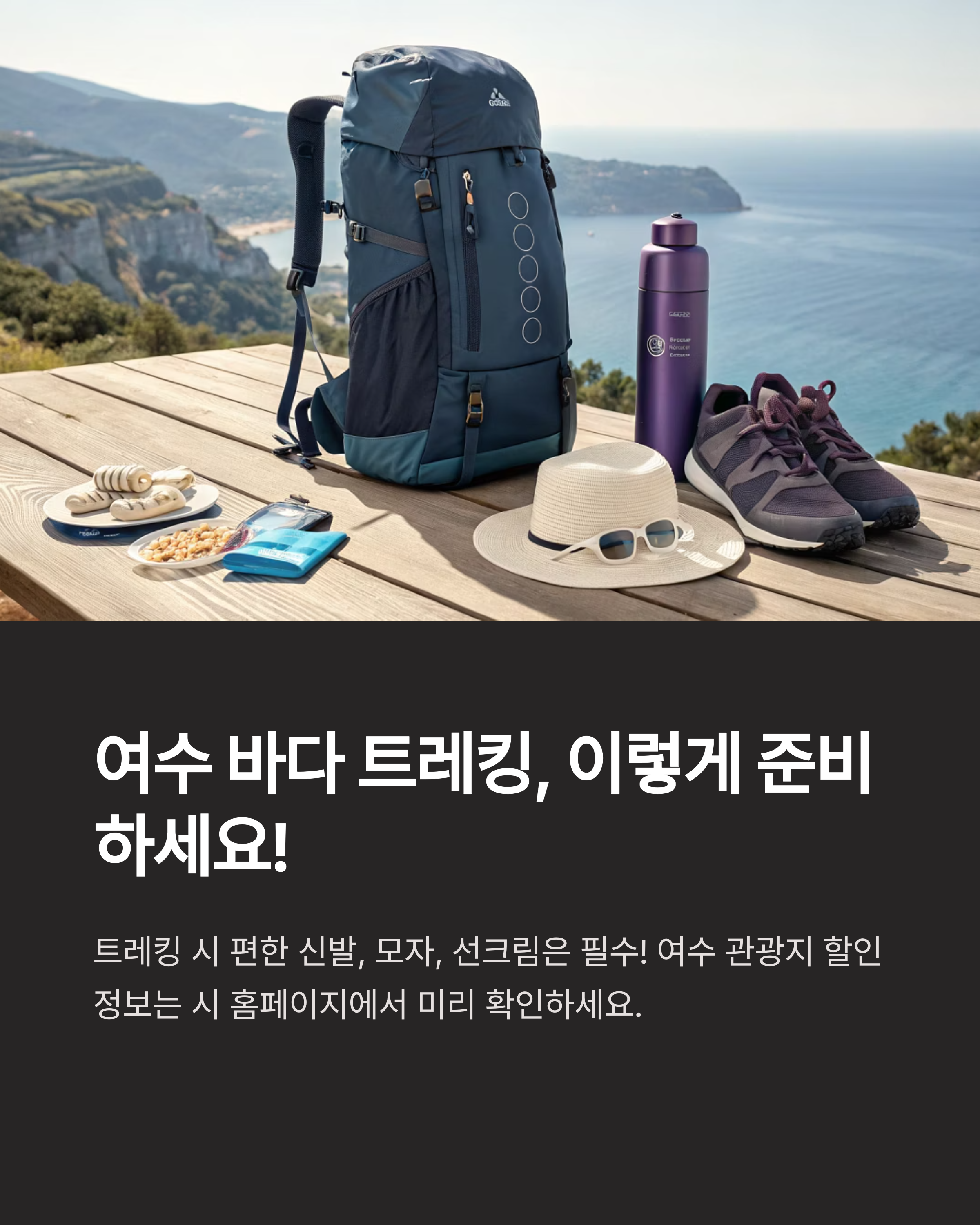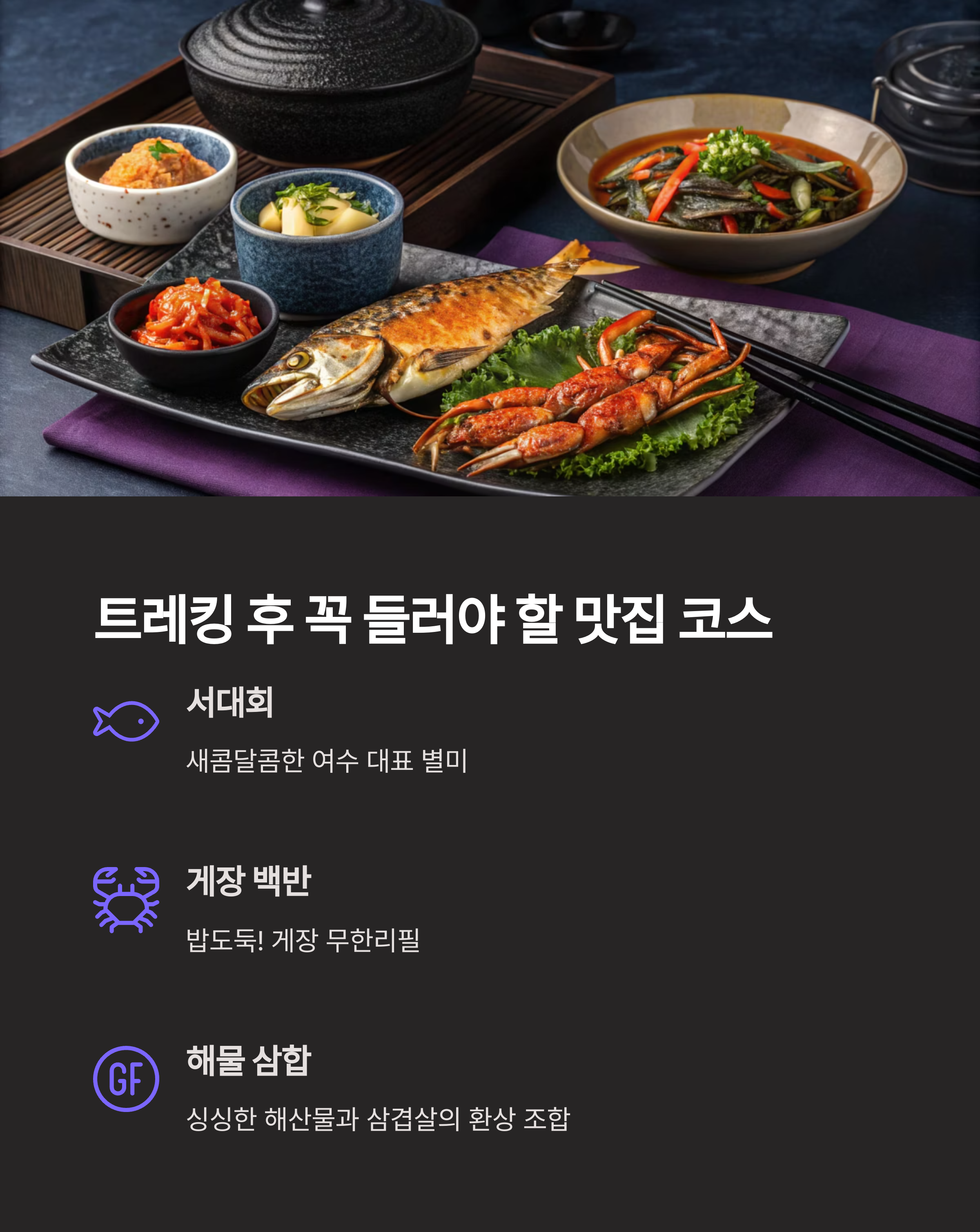 - 트레킹 후에는 여수 지역 맛집에서 신선한 해산물로 건강한 식습관을 실천해보세요.