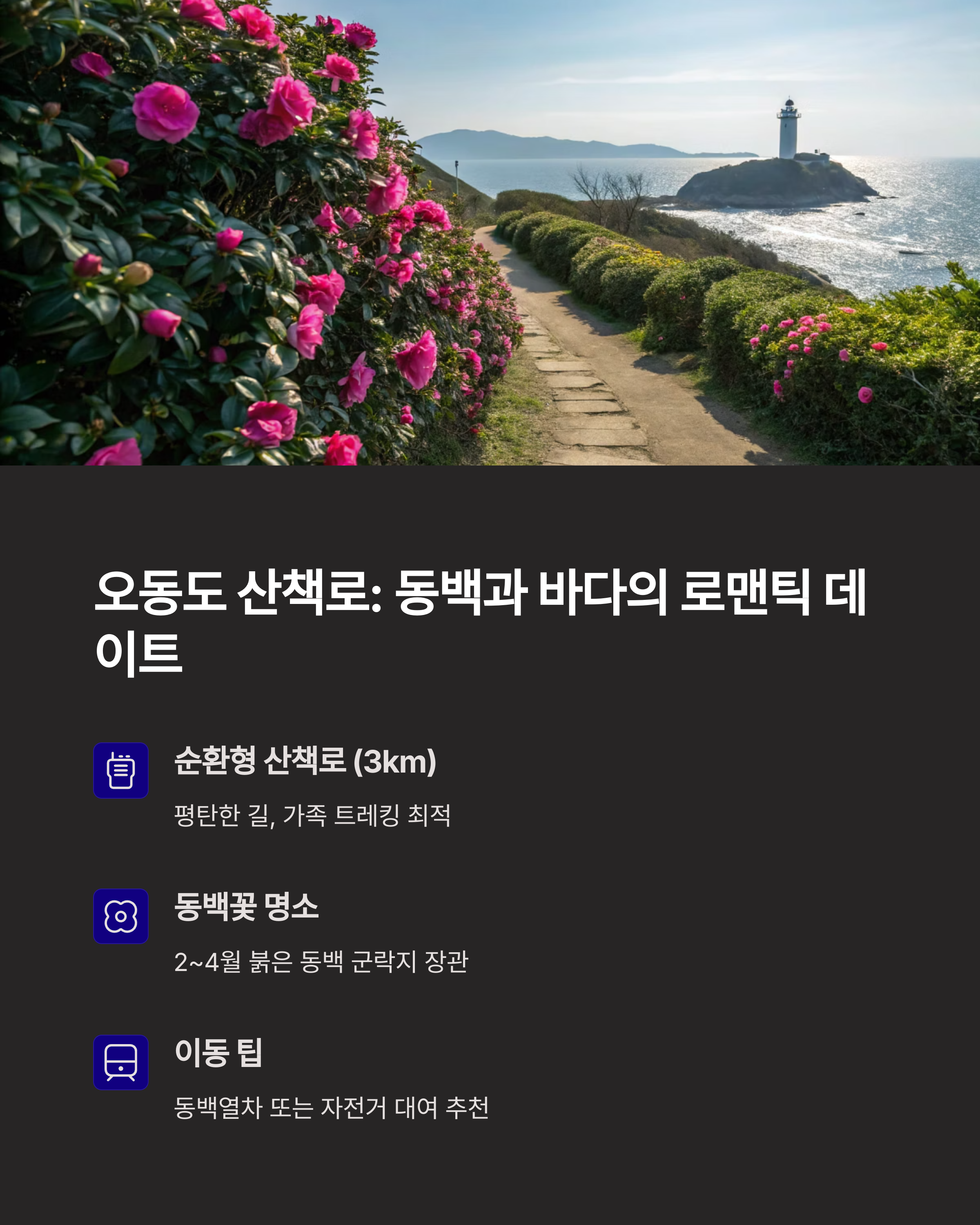 특히 동백꽃이 피는 봄철에는 더욱 아름다운 풍경을 자랑하며, 가족 단위 여행객에게도 추천합니다. 오동도 산책로는 한국의 아름다운 길 100선에 선정될 만큼 경치가 뛰어나며, 여수 지역 여행의 필수 코스입니다.