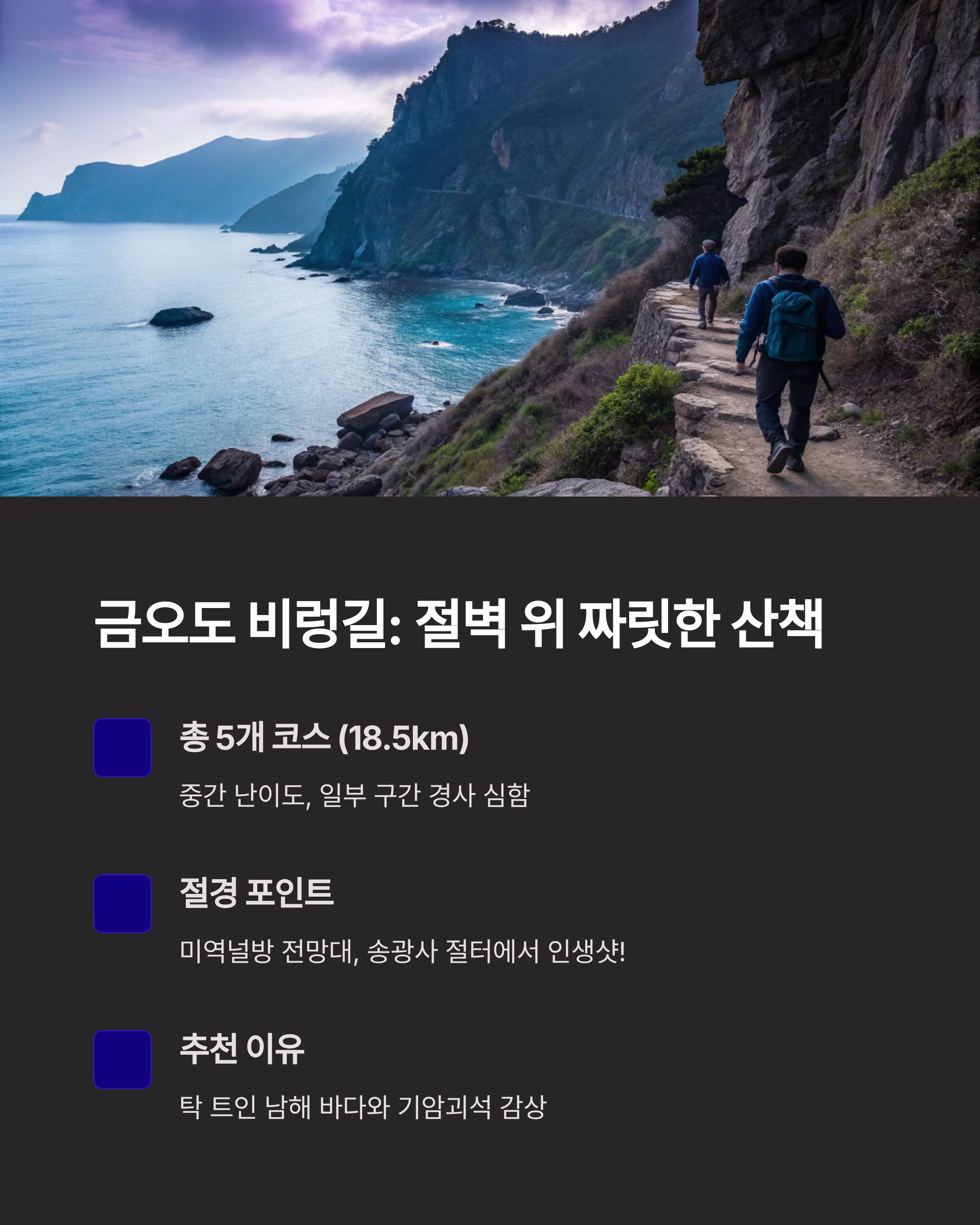 - 금오도, 안도 등 섬 트레킹은 배편 시간표를 미리 확인하고 예약하는 것이 좋습니다.