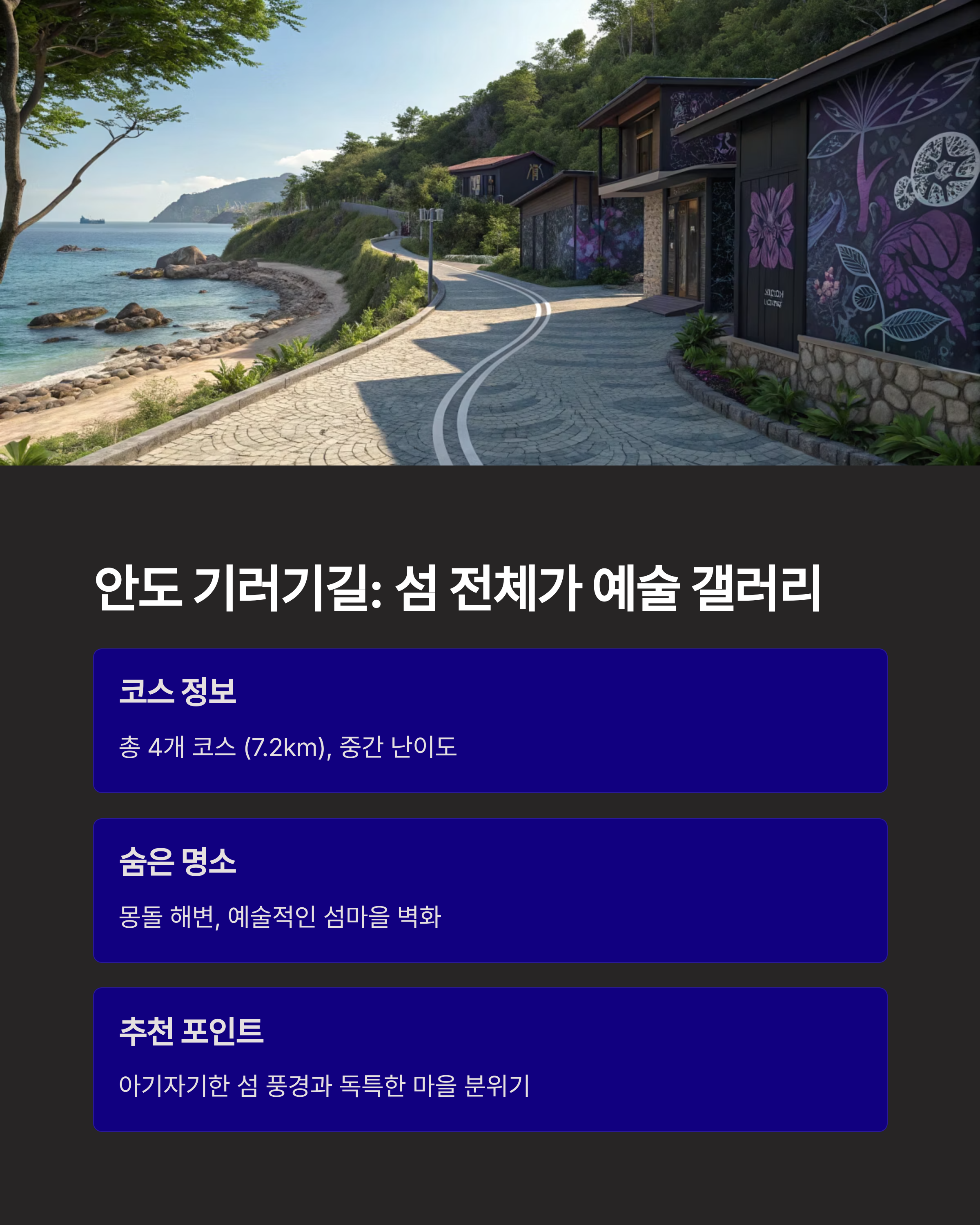 금오도와 연결된 안도에는 해안선을 따라 걷는 기러기길이 있습니다. 약 1시간 정도 소요되는 이 코스는 몽돌해수욕장과 하얀 모래 해안, 상산 등 다양한 자연 풍경을 감상할 수 있습니다. 금오도 비렁길과 연계해 하루 코스로 즐기기 좋으며, 여수 맛집 추천 코스와도 가까워 여행의 즐거움을 더해줍니다.